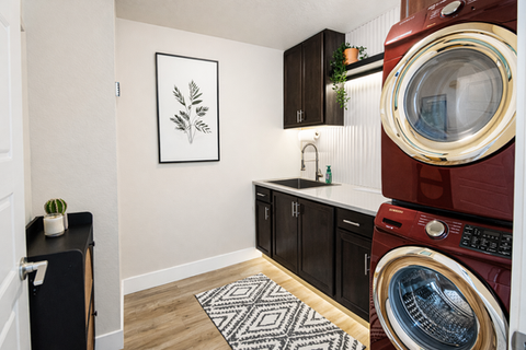 Upstairs, the primary suite offers a peaceful retreat with a walk-in closet and dual vanity. A luxury laundry room with a modern utility sink and LED lighting adds convenience, while two additional bedrooms and a full bath complete the level. Even the oversized two-car garage is upgraded, boasting massive 12-foot ceilings, modern lighting, and new epoxy flooring.