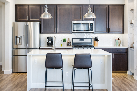 Sleek Kitchen: Quartz waterfall island & stainless steel appliances